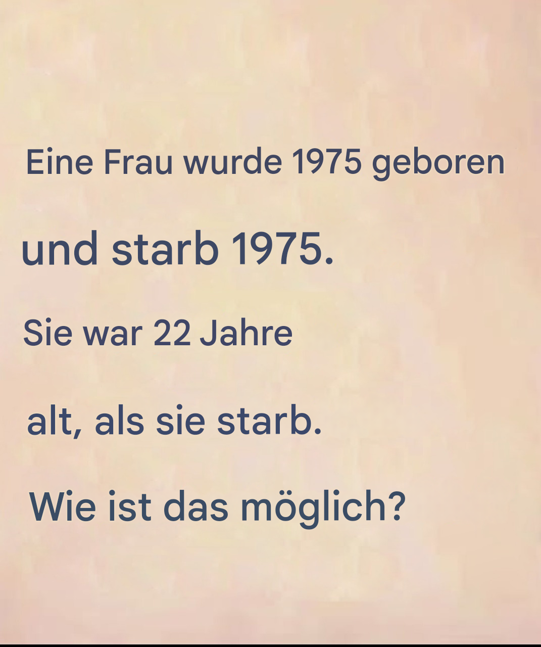 Stellen Sie sich vor: Sie stoßen beim Durchscrollen Ihres Newsfeeds auf diesen seltsamen Satz: „Eine Frau wurde 1975 geboren und starb 1975. Sie war 22 Jahre alt.“ Sie sind sprachlos. Unverständlich? Rätselhaft? Da muss doch mehr dahinterstecken … Aber wo ist der Haken? Halten Sie sich fest, denn dieses Rätsel stellt unsere Logik und unsere automatischen Reaktionen infrage und erfordert einiges an Fantasie. Was, wenn der Schlüssel gerade darin liegt, nicht so zu denken, wie wir es normalerweise tun?